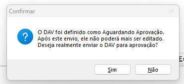 4. Clicando em SIM, o DAV é gravado e bloqueado, aguardando um aprovador.